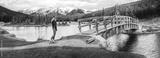 Girl in leather jacket about to cross bridge infront of mountains