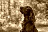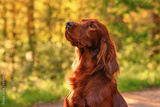 Irish red setter portrait on green grass background, outdoors, horizontal