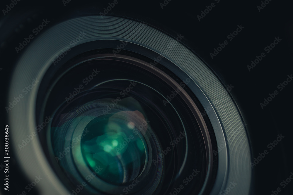 Close up beautiful camera lens on a black background. Macro view..