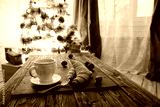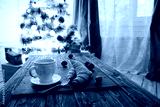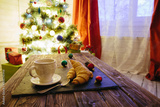 Mug with hot chocolate on a wooden table with Christmas decorations on a background of the Christmas tree