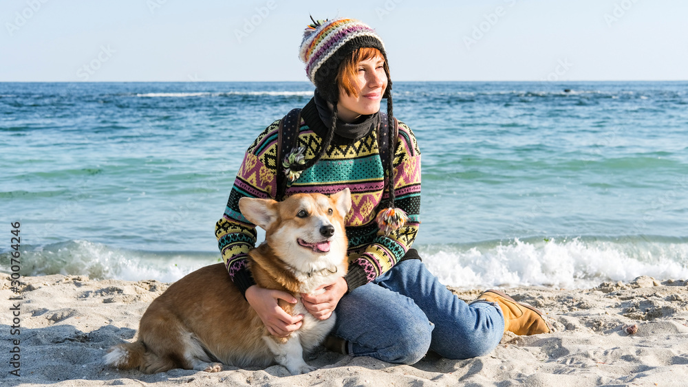 Young happy female walk with cute corgi dog on the autumn sunny beach