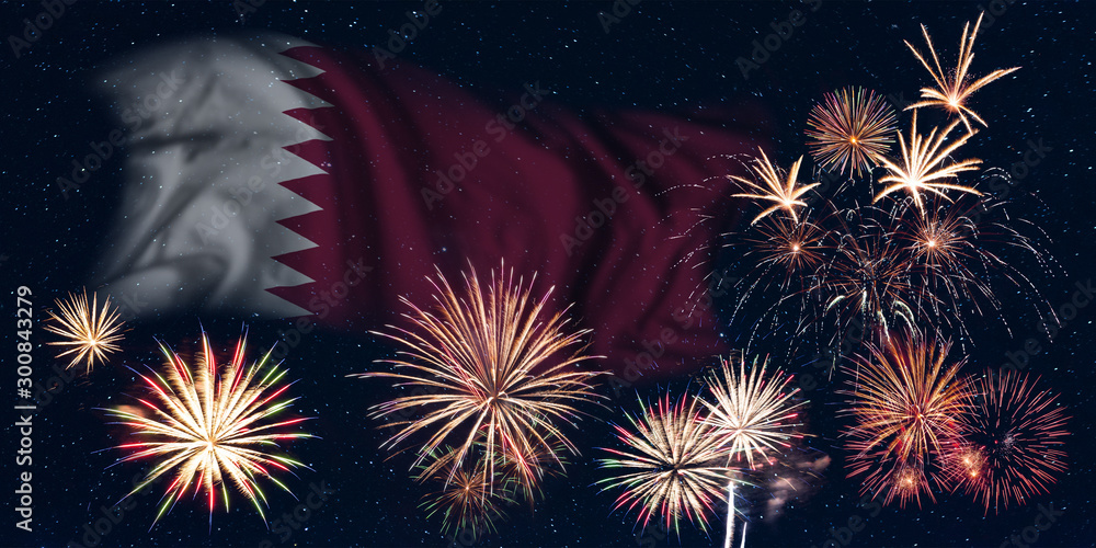 Fireworks and flag of Qatar
