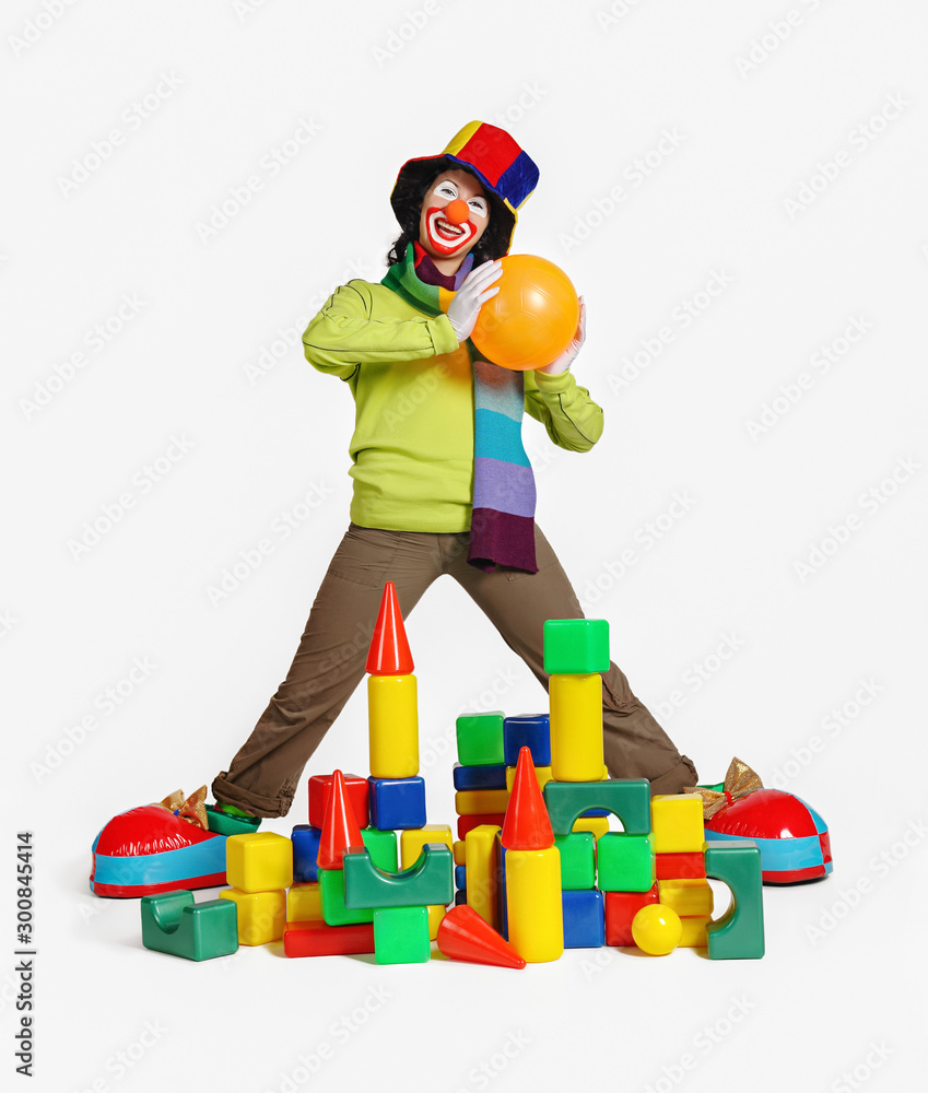 Female clown, ball in his hands, with painted face in hat and big boots. A lot of geometric cubes. Studio shot.