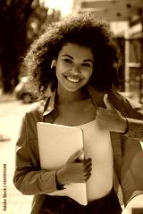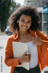 Portrait of successful business woman holding laptop computer, showing thumb up. Young emotional African American girl listening music, using wireless earphones, walking on urban street