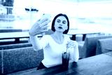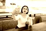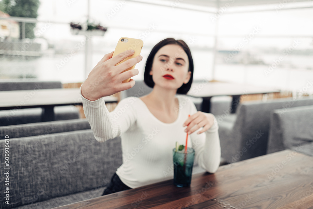 Close Up Portrait of Beautiful Brunette Girl in White Sweater Using Mobile Phone