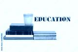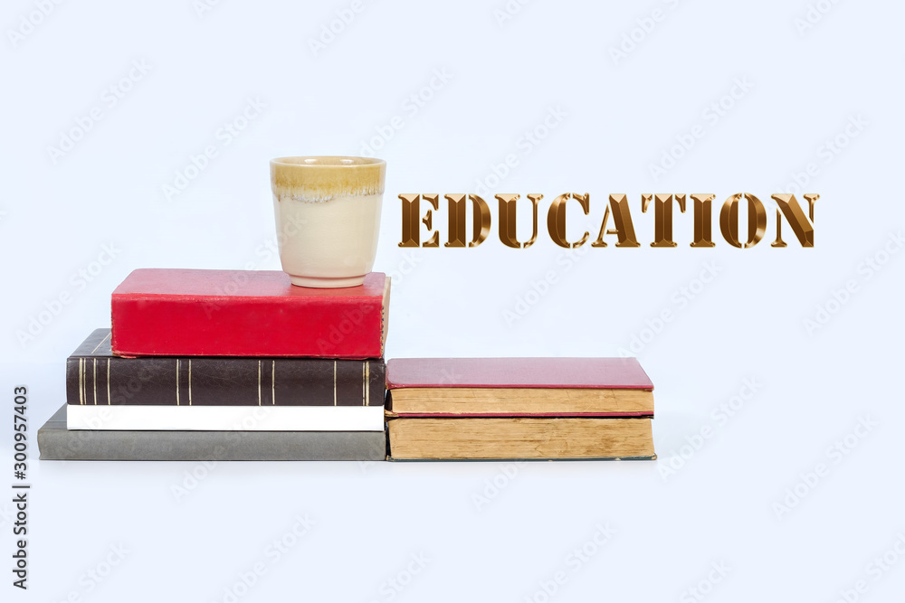 Old text books with cup of coffee and gold text education concept.
