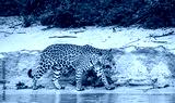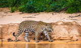 Jaguar is walking along the sand against the backdrop of beautiful nature. South America. Brazil. Pantanal National Park.