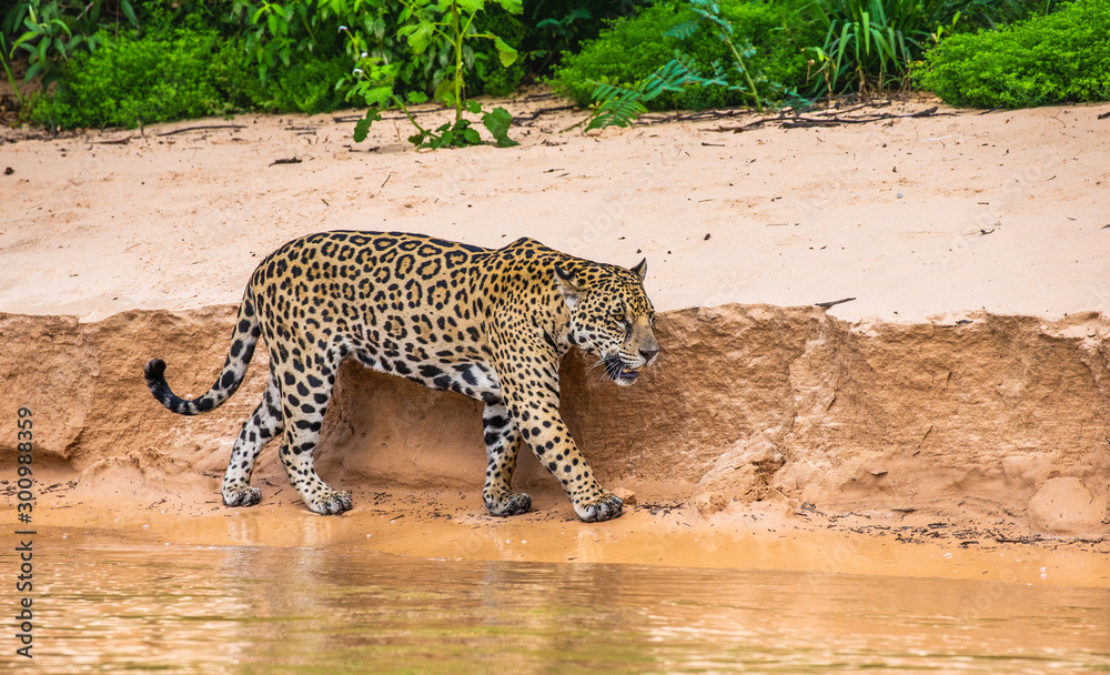 Jaguar is walking along the sand against the backdrop of beautiful nature. South America. Brazil. Pantanal National Park.