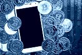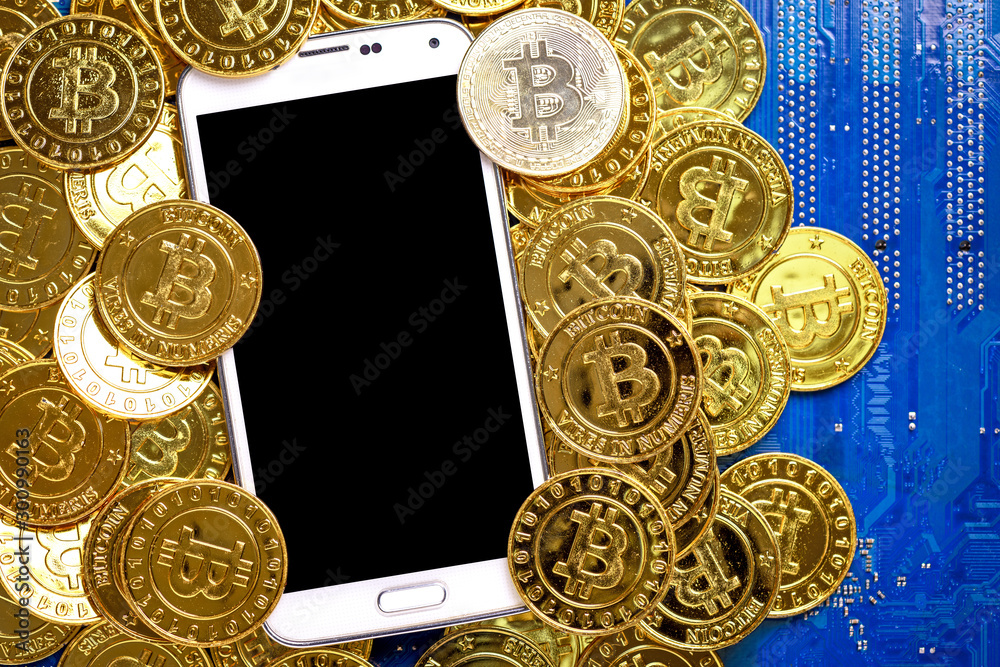 Smartphone with bitcoin - bit coin BTC the new virtual electronic money, investment concept
