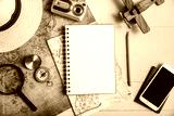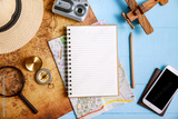 Travel plan, trip vacation, tourism mockup - Outfit of traveler on wooden background