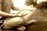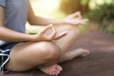 Woman practices yoga and meditates in the lotus position in peaceful place