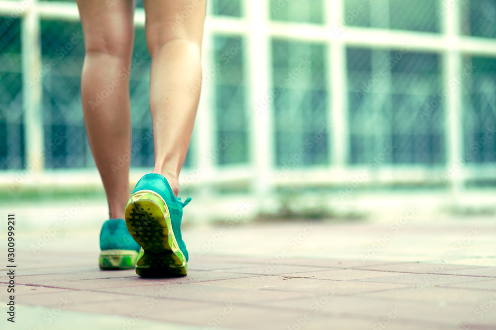 Runner feet running on concrete road in park - fitness sunrise jog workout welness concept