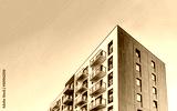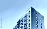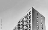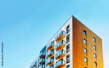 Part of Modern residential apartment with flat building exterior. Detail of New luxury house and home complex. Fragment of City Real estate property and condo architecture. Copy space. Blue sky