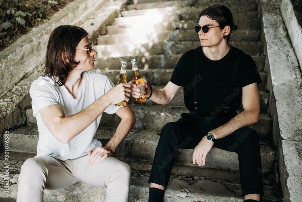 Two Stylish Twins Brothers Having Fun Drinking Beer on the Stairs