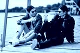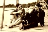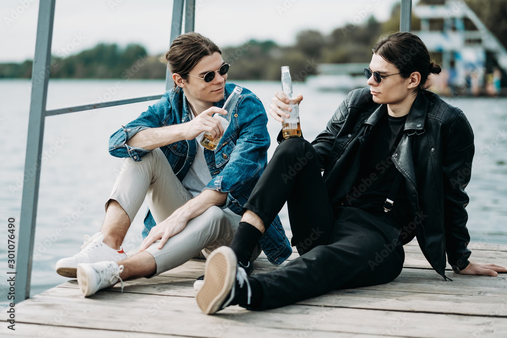 Two Stylish Twins Brothers Having Fun Drinking Beer on the Pier Near the River