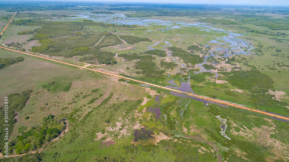 Aerial view of Transpantaneira dirt road crossing a lagoon over a small bridge in the typical landscape of North Pantanal Wetlands, Mato Grosso, Brazil