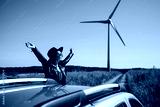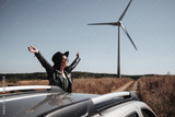 Happy Traveling Girl Enjoying a Car Trip on the Field Road with Electric Wind Turbine Power Generator on the Background