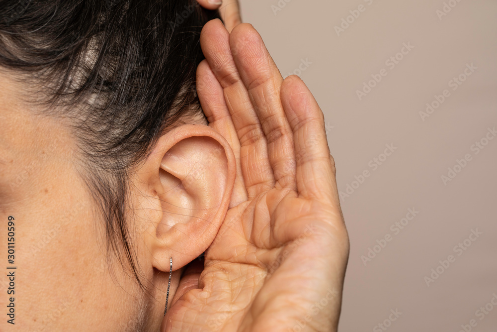 Woman listening, hear gesture close up