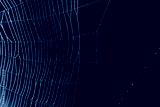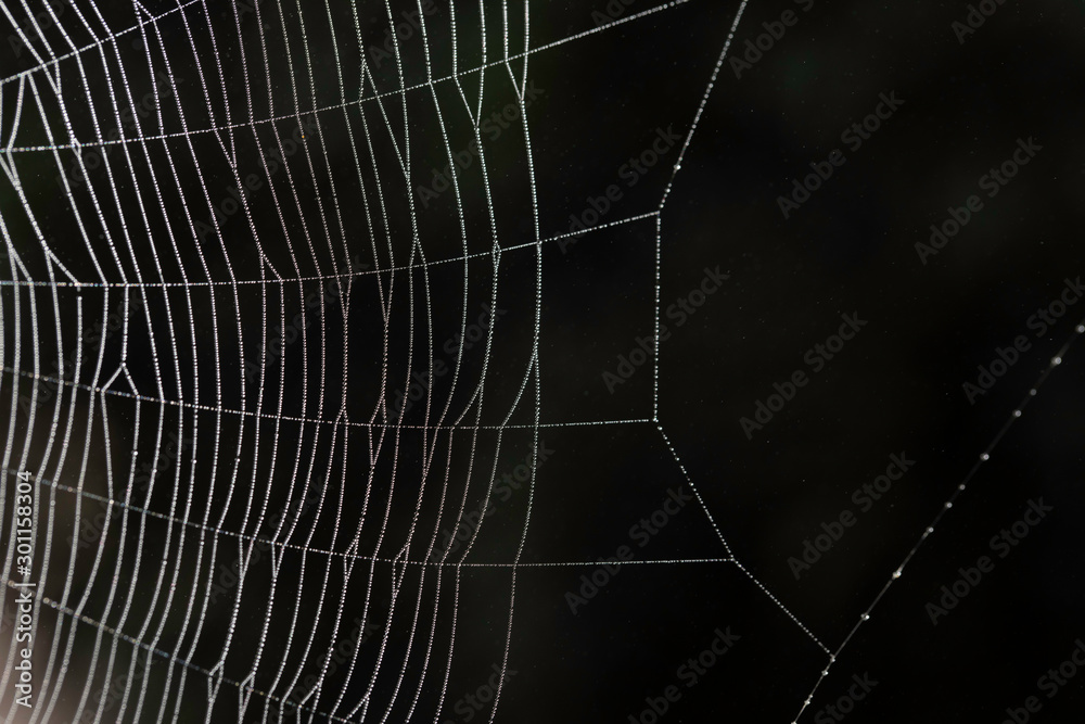 Spider web with morning dew on dark blurred background