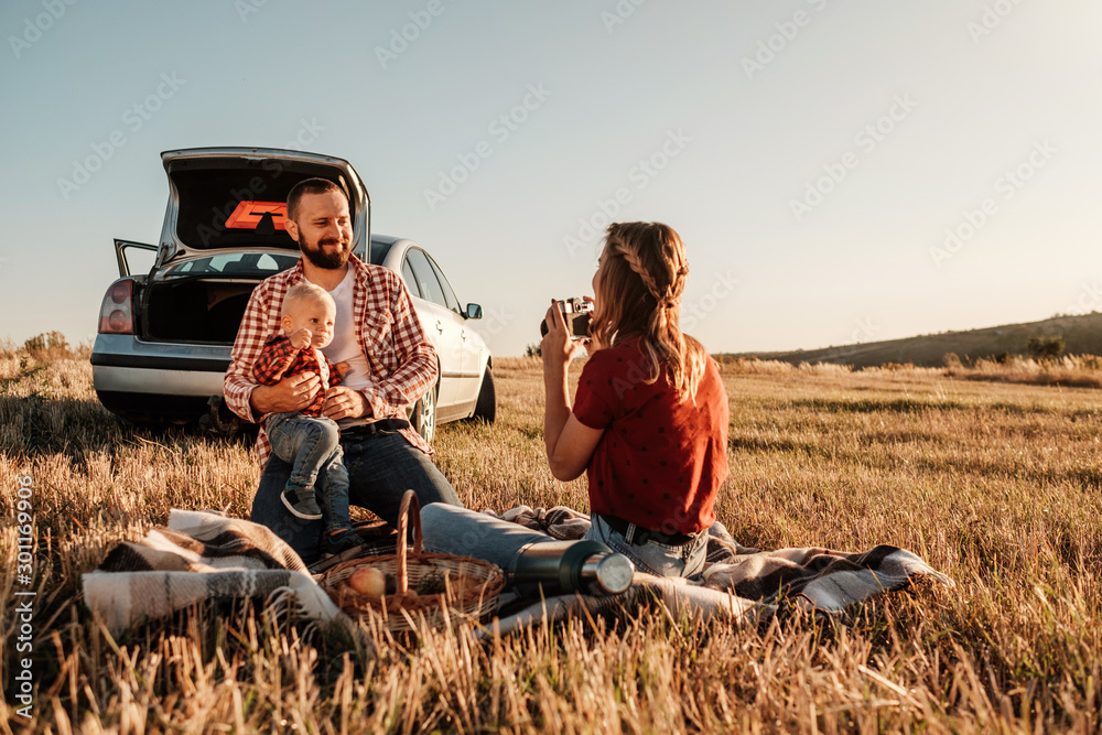 Happy Young Family Mom and Dad with Their Little Son Enjoying Summer Weekend Picnic Sitting on the Plaid Near the Car Outside the City in the Field at Sunny Day Sunset, Vacation and Road Trip Concept