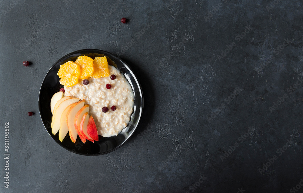plate of oatmeal with pear, orange and cranberries on a black background, top view ,