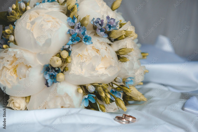 wedding bouquet of peonies and blue flowers with 2 gold wedding rings on a white