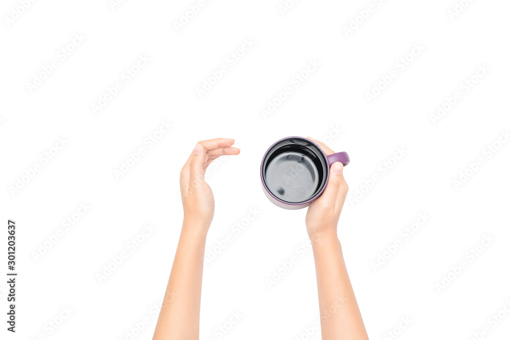 Coffee cup in hand. Isolated on white background.