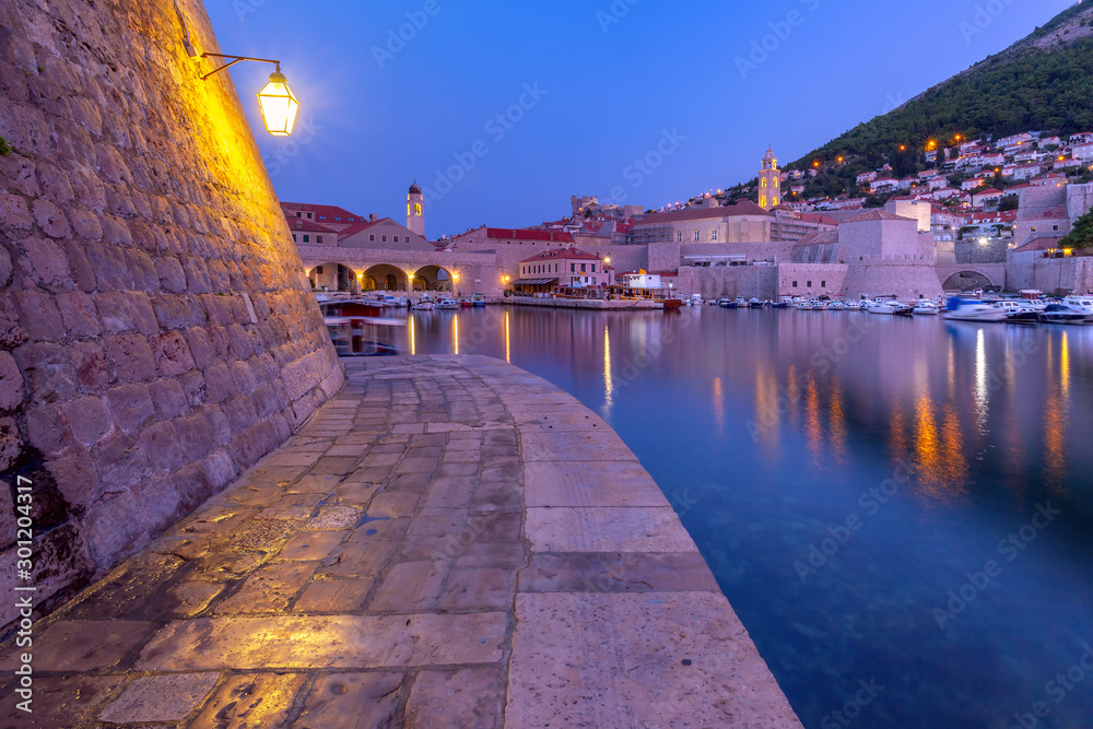 Old Harbour and Old Town of Dubrovnik durring morning blue hour, Croatia