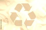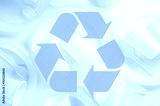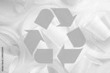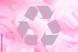 Disposable plastic tableware and recycling sign on a light background in pastel colors. Minimalistic ecologically clean still life. Pop Art. And ecology problem concept.