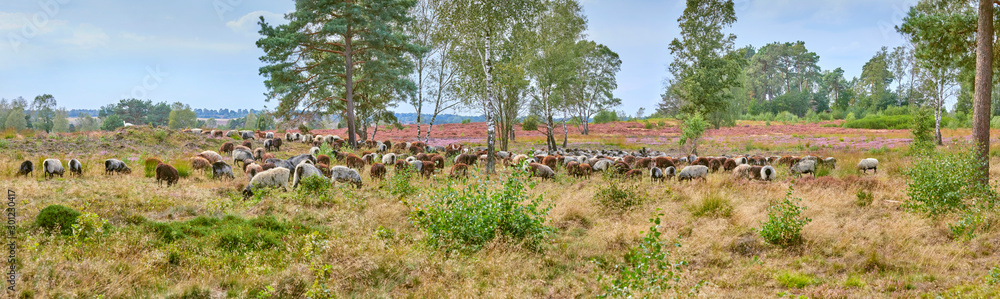 Schafherde in der Lüneburger Heide (Deutschland) der berühmten "Heidschnucken"