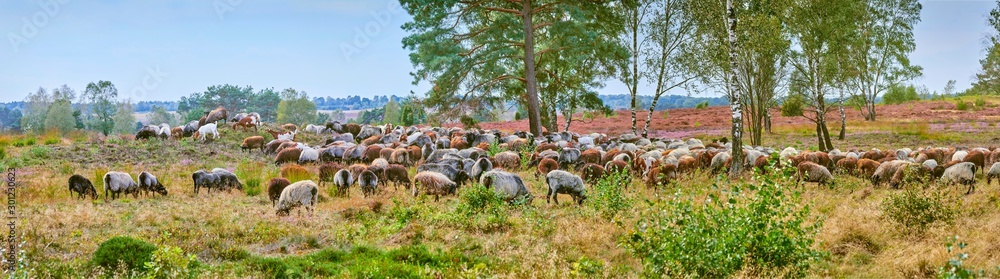 Schafherde in der Lüneburger Heide (Deutschland) der berühmten "Heidschnucken"