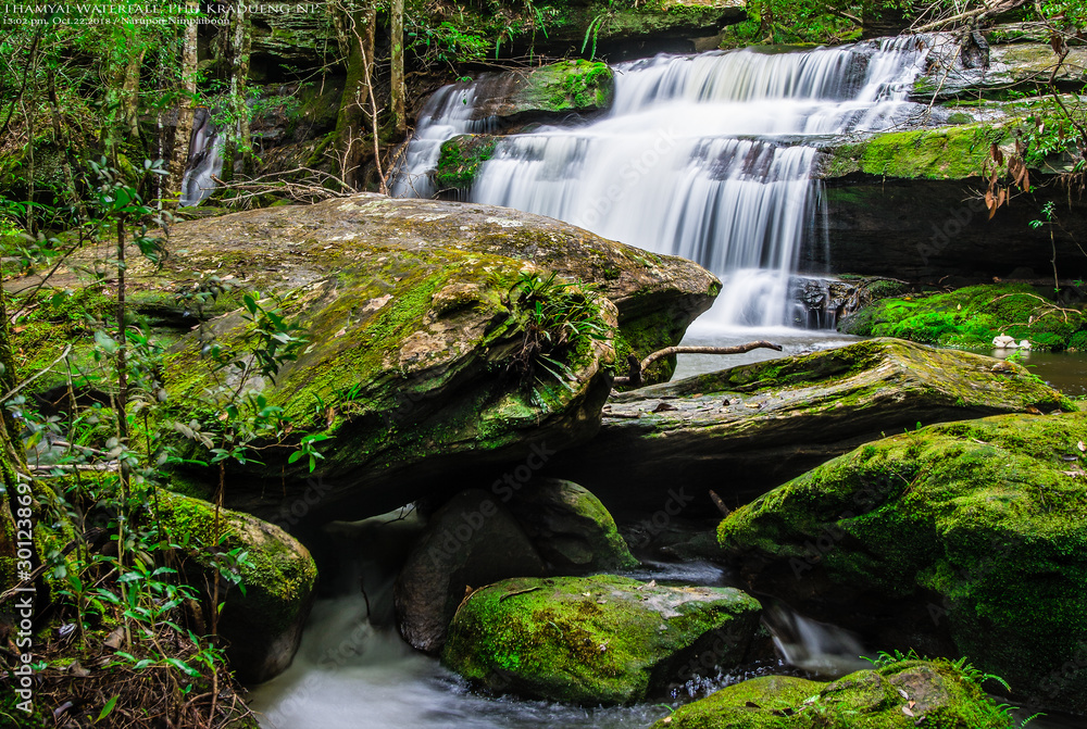 Tham yai waterfall, a beautiful waterfall in a forest filled with green trees at Phu Kradung National Park in the rainy season, which is famous tourist destination in Thailand.