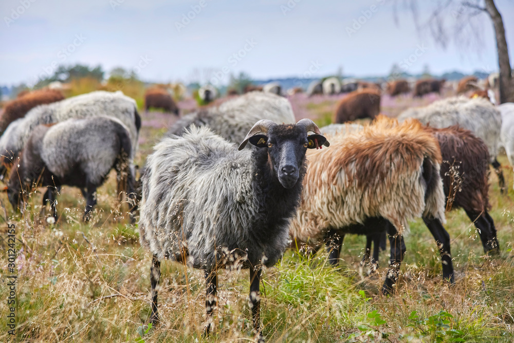 Schafherde in der Lüneburger Heide (Deutschland) der berühmten "Heidschnucken"