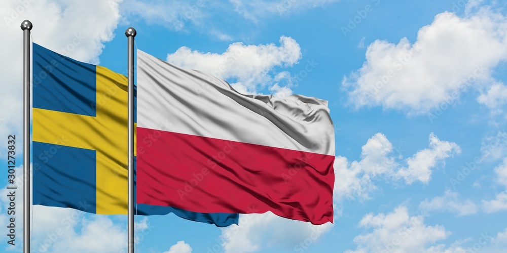Sweden and Poland flag waving in the wind against white cloudy blue sky together. Diplomacy concept, international relations.