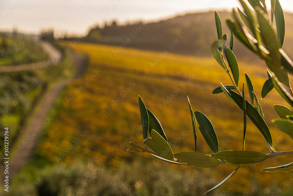 Close up of an olive branch with Chianti vineyards in background