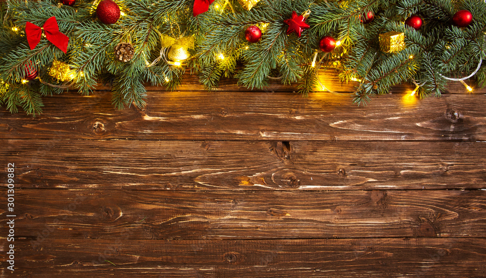 Christmas decoration and christmas lights frame on wooden background Decorating and christmas tree