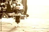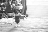 Mulled wine with spices and Christmas tree on wooden background Decorating and christmas tree