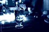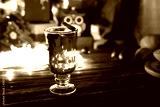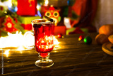 Traditional winter drink mulled wine in a glass on a wooden table Decorating and christmas tree