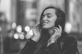 Young happy stylish trendy casual hipster woman teenager listening to music on a wireless headphone while walking around the city. Music lover enjoying music