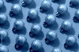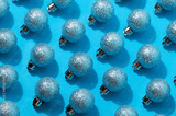 Blue Christmas baubles decoration on neon background with copy space. New Year greeting card. Minimal style. Flat lay..