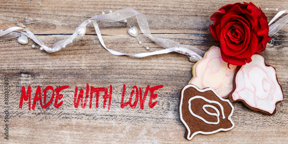 Header with Rose Cookies and Flower, Text english made with love
