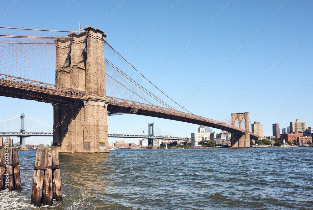 Brooklyn Bridge and East River on a sunny day, New York City, USA.