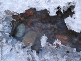 Ice on a mountain stream. Close-up. Winter snow frost ice background. Ice on the river landscape. Ecology, global warming and melting glaciers concept.