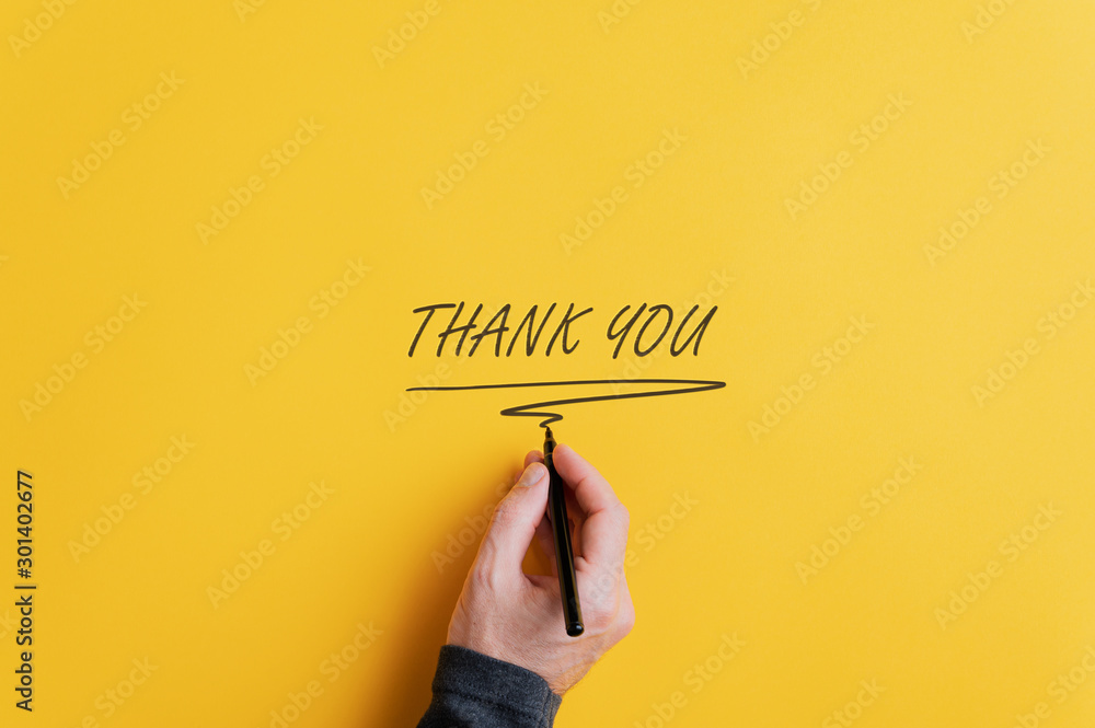 Male hand writing a Thank you sign