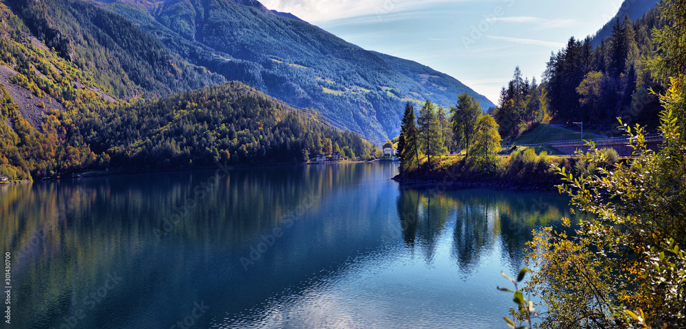 beautiful view of a mountain lake in the autumn sunny day. Poschiavo, Switzerland