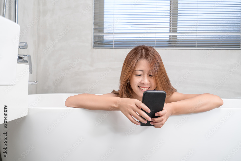 Young and beautiful girl using phone relaxing in the retro bath indoors