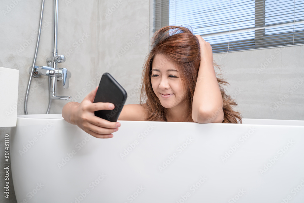 Young and beautiful girl using phone relaxing in the retro bath indoors