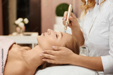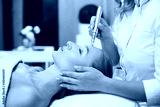 Beautiful woman getting face peeling procedure in a beauty clinic, close-up portrait. Girl with perfect face skin on a non-surgical facelifting procedure. Rejuvenating facial treatment.