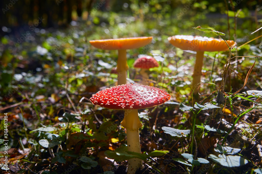Beautiful poisonous fly agaric in the forest. Close-up.