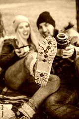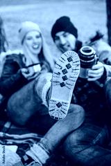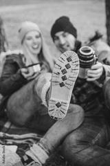 Travel couple camping with thermos having fun in the forest. Concept of trekking, adventure and seasonal vacation.